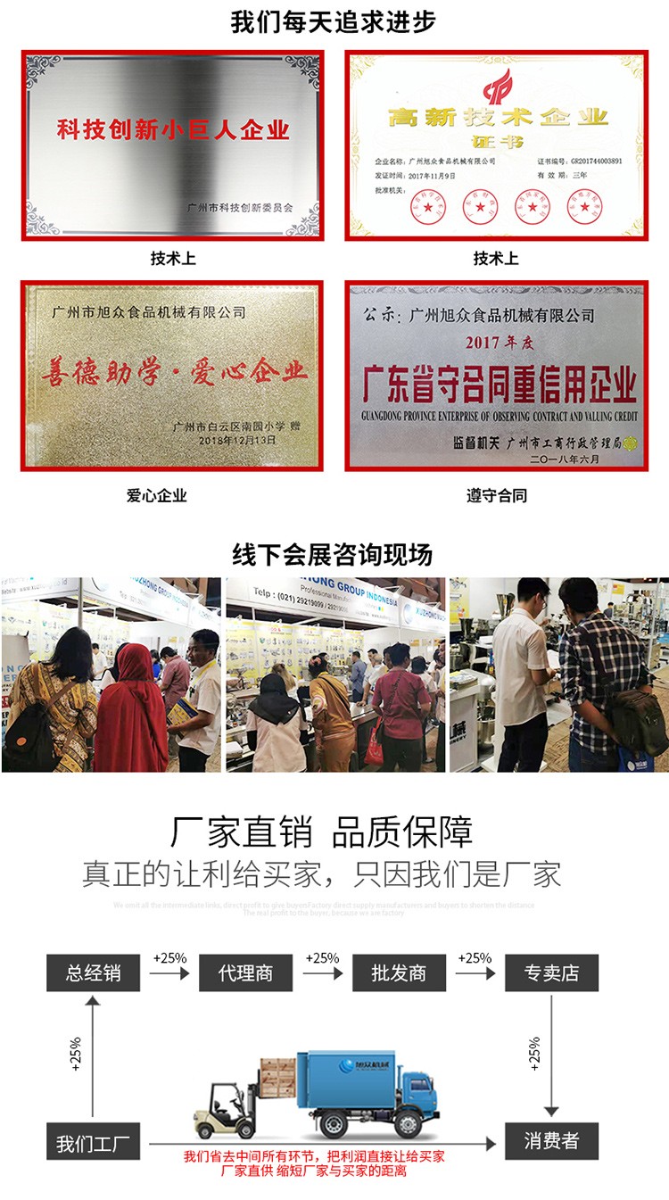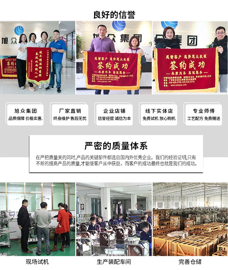 廣州旭眾食品機(jī)械有限公司是一家集科研開發(fā),生產(chǎn)設(shè)計,營銷服務(wù)為一體的現(xiàn)代化生產(chǎn)企業(yè)。現(xiàn)代化生產(chǎn)車間,精湛制造技術(shù),所產(chǎn)機(jī)械歷經(jīng)市場重重考驗(yàn),不斷贏得海內(nèi)外客戶的贊譽(yù)。