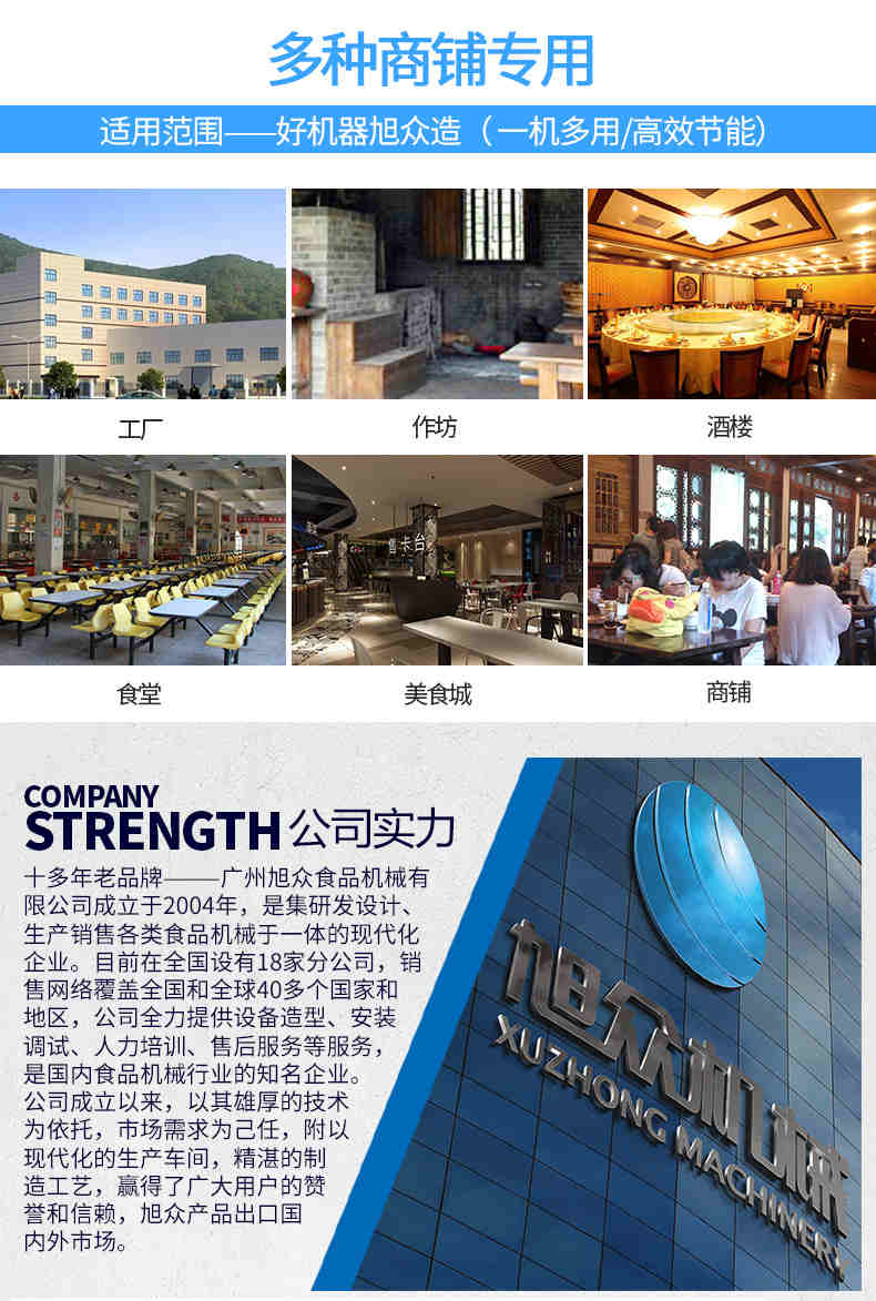 廣州旭眾食品機械有限公司是一家集科研開發(fā),生產(chǎn)設計,營銷服務為一體的現(xiàn)代化生產(chǎn)企業(yè)?,F(xiàn)代化生產(chǎn)車間,精湛制造技術,所產(chǎn)機械歷經(jīng)市場重重考驗,不斷贏得海內(nèi)外客戶的贊譽。