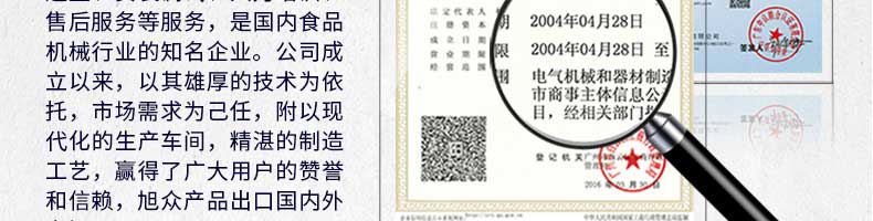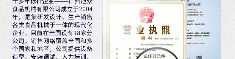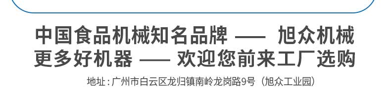 廣州旭眾食品機(jī)械有限公司是一家集科研開(kāi)發(fā),生產(chǎn)設(shè)計(jì),營(yíng)銷(xiāo)服務(wù)為一體的現(xiàn)代化生產(chǎn)企業(yè)。現(xiàn)代化生產(chǎn)車(chē)間,精湛制造技術(shù),所產(chǎn)機(jī)械歷經(jīng)市場(chǎng)重重考驗(yàn),不斷贏得海內(nèi)外客戶(hù)的贊譽(yù)。