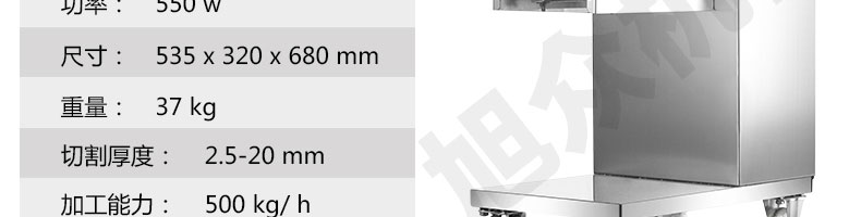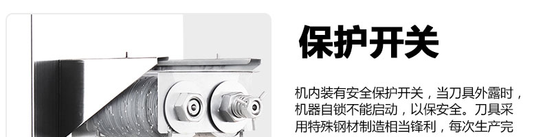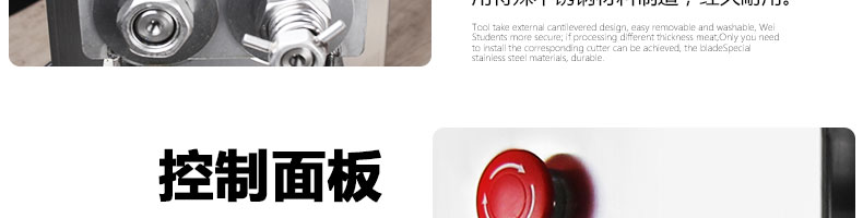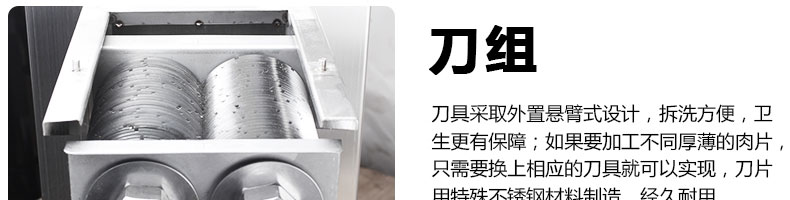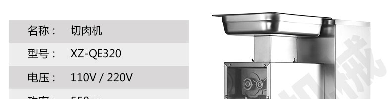 XZ-QE切肉機,是一款可方便移動的肉類加工設備,配置單層刀具一次性切肉片,二次切肉絲,再切成粒。底座設置有滑輪,移動靈活,輕松便捷;刀具采取外置懸臂式設計,拆洗方便,衛(wèi)生更有保障;配置多種刀具,可加工不同厚度的肉片,實現(xiàn)一機多用;機內(nèi)裝有安全保護開頭,刀具外露時,機器自鎖不能啟動,以保安全;刀片用特殊不銹鋼材料制造,經(jīng)久耐用;卸下的刀具,不用清洗直接放置在6攝氏度以下的冰箱里,刀具余肉不發(fā)臭。